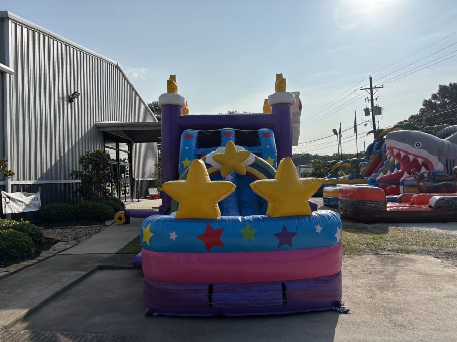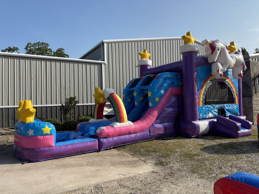 Transform your little one’s special day into a fairytale adventure with our enchanting Unicorn Wet-Dry Combo! This vibrant bounce house combo is the perfect centerpiece for any party or event in Beaumont and the surrounding areas. Designed with a whimsical unicorn theme, the color scheme showcases beautiful shades of purple, blue, and pink that will delight children and create unforgettable memories.